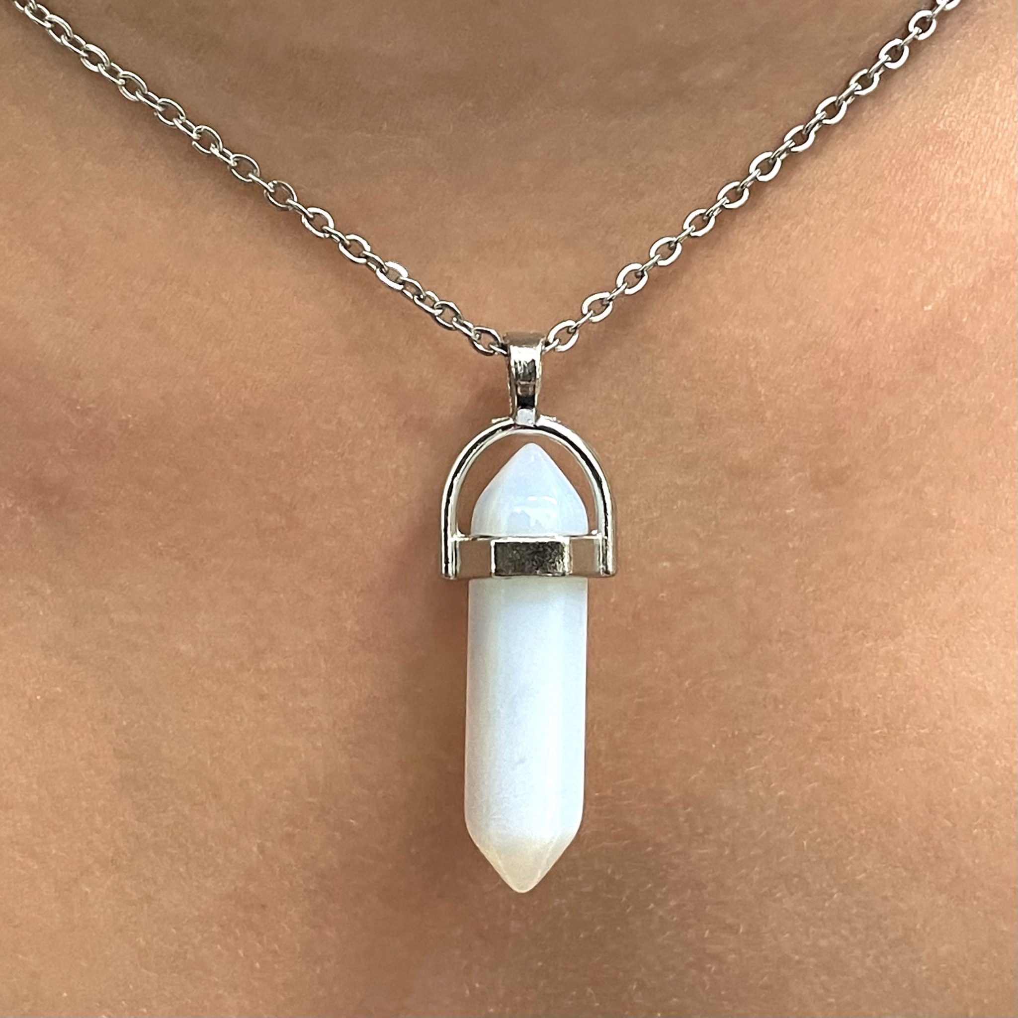Beautiful genuine crystal jewellery set in high-quality surgical stainless steel. Opalite double terminated points necklace.